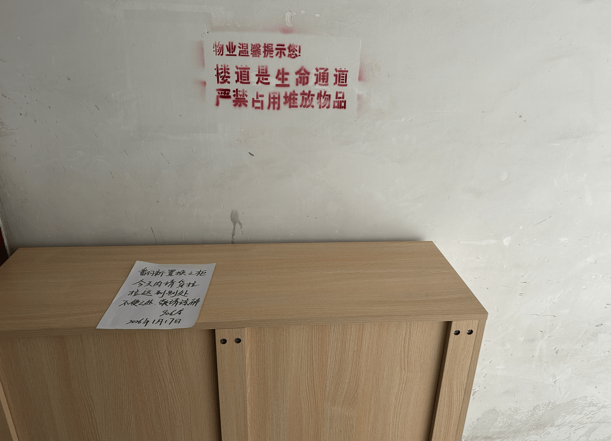 个别楼层虽仍有零星自行车或家具暂存■,但已有居民主动贴上“今日清走”的便条。在9层走廊●•,记者看到两件体积较大的家具柜摆放在公共区域,柜上贴有手写纸条——“翻新置换之柜,今天内请货拉拉运到别处,不便之处◇,敬请谅解■○”。这也反映出部分居民已有意识主动清理占用的楼道。