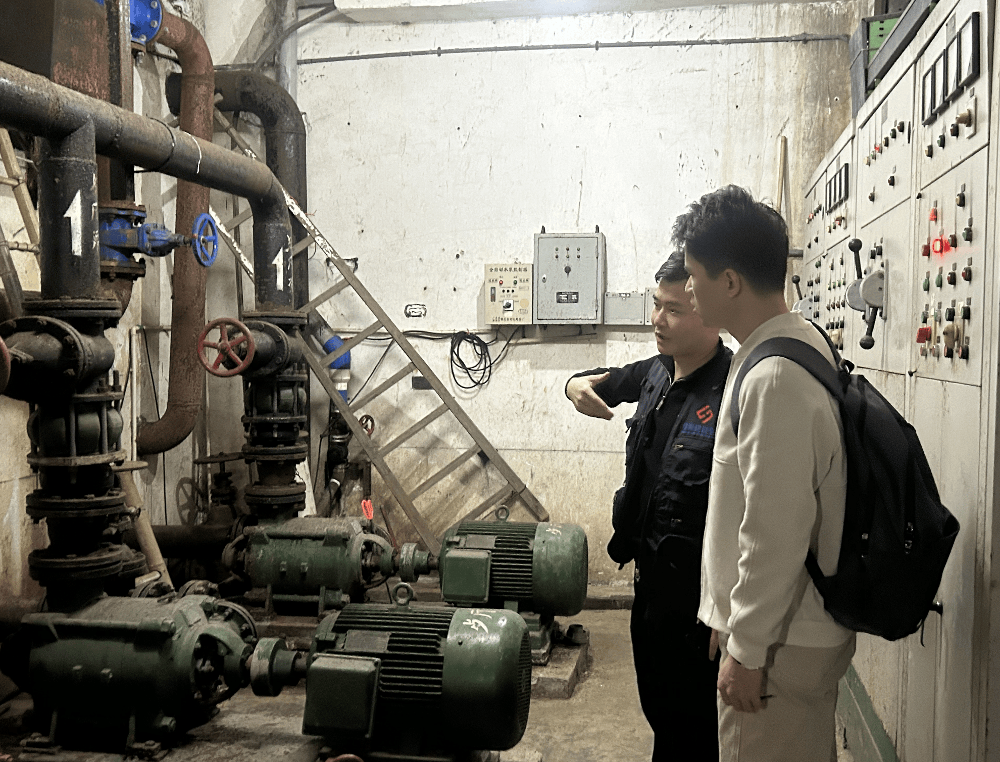 记者跟随物管进入小区地下库房查看,库房内有生活水泵、消防水泵、喷淋水泵各两座。杨先生在电箱上逐个按动了消防泵、喷淋泵的按钮,仪表盘指针随即加压跳转,水泵内发出△…“轰”的蓄水声,证明设备处于正常运转状态。